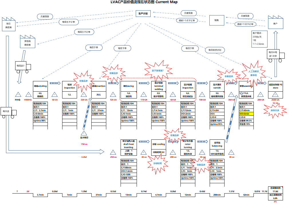 Trí na Léarscáileanna Sruth Luacha agus léarscáileanna staid reatha na bpríomh-mhúnlaí meaisín anailísithe a chomhcheangal, chomh maith leis na sé phrionsabal a bhaineann le sruthanna luach lean (sreabhadh a chruthú, am luaidhe a ghiorrú, dramhaíl a laghdú, fardal a ísliú, úsáid pearsanra a fheabhsú, agus úsáid spáis a fheabhsú), d'aithin an fhoireann deiseanna feabhsúcháin trí réamh-anailís VSM.
