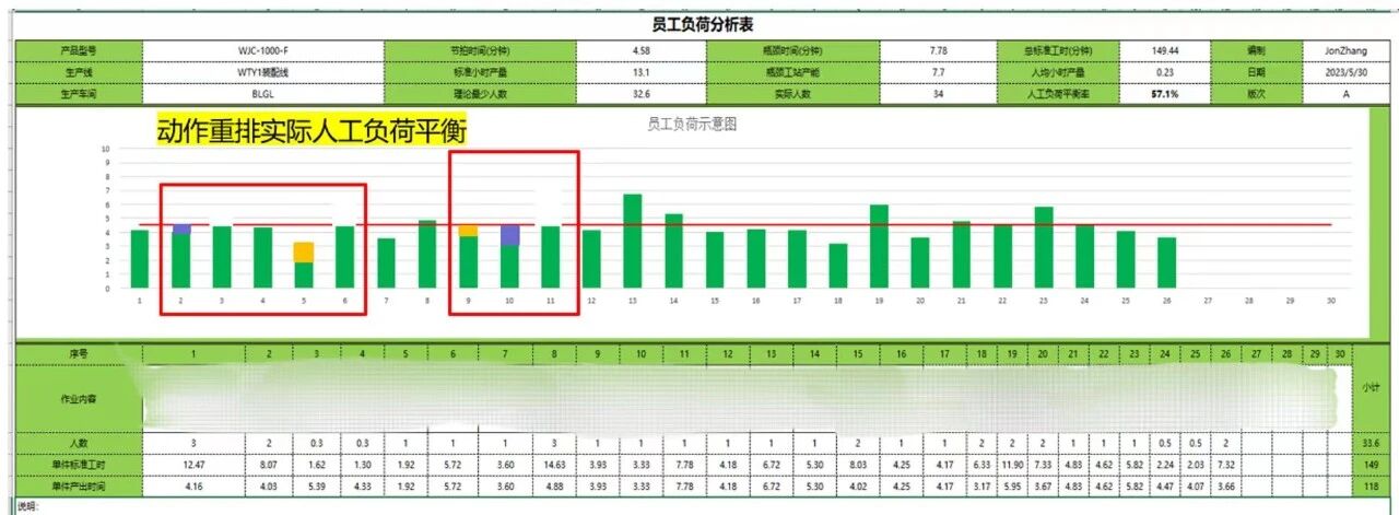 Is gné bhunúsach d'fheabhsú acmhainne ráta ualach oibre na bhfostaithe. Mar gheall ar amanna timthrialla neamhréireach idir próisis, bhí an t-aschur iarbhír sách íseal. Taithí ghiarála carntha ó fheabhsuithe cothromaíochta líne roimhe seo, bhí an roinn ME i gceannas ar thionscnaimh a thiomáint chun ráta cothromaíochta ualach oibre na bhfostaithe líne táirgeachta a mhéadú. Trí phrionsabal ECRS a chur i bhfeidhm (Díchur, Comhcheangail, Athshocrú, Simpligh) chun próisis a bharrfheabhsú, shroich ráta comhardaithe ualach oibre na bhfostaithe os cionn 82%.