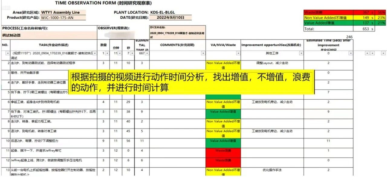 Mar an uirlis feabhsúcháin córasach is luaithe a tugadh isteach go hinmheánach, tá taithí feabhsúcháin soladach carntha ag anailís ama. Bhí ról ceannródaíoch aige freisin san fheachtas feabhsaithe VSM foriomlán - ag feidhmiú mar leanúint ar aghaidh le feabhsuithe roimhe seo agus mar nasc le feabhsuithe tionscadail-shonracha ina dhiaidh sin. Rinne na foirne feabhsúcháin pearsanra tiomnaithe a shannadh d’oibríochtaí na bhfostaithe a scannánú ag gach próiseas de réir phrionsabail chaighdeánacha uaireanta oibre. Rinne baill foirne agus fiú fostaithe túslíne comh-athbhreithniú ar na físeáin arís agus arís eile, rinne siad lobhadh agus anailís ar ghluaiseachtaí oibre, agus rinne siad ransú smaointe comhchoiteann chun deiseanna feabhsúcháin a aithint agus moltaí a mholadh, ag ceapadh plean feabhsúcháin ar deireadh.