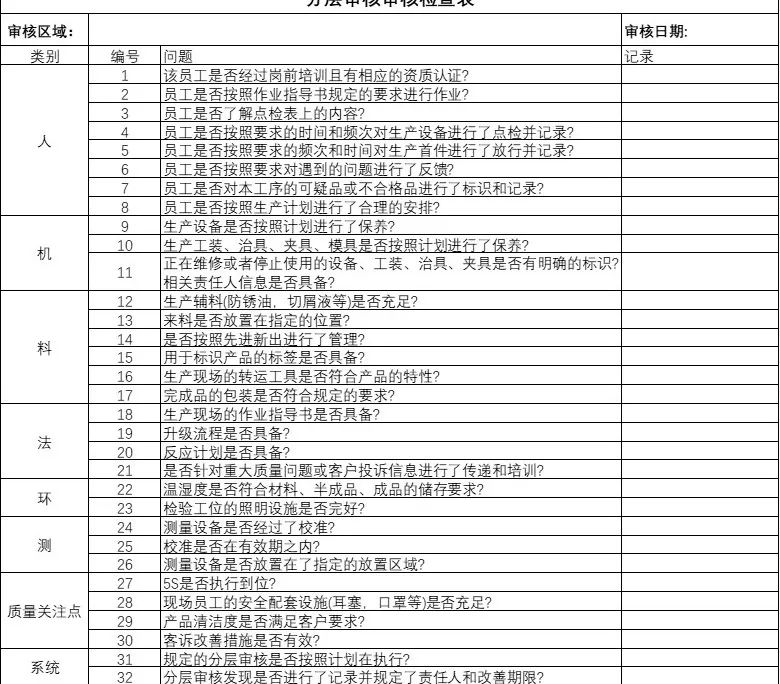 Leagann an tionscnamh béim ar rannpháirtíocht na bhfostaithe go léir, le bainisteoirí ag leibhéil éagsúla a bhfuil baint acu le gníomhaíochtaí iniúchta ar an láthair ar an láithreán táirgthe. Bunaithe ar struchtúr eagraíochtúil na cuideachta, is iad seo a leanas na leibhéil atá i gceist: