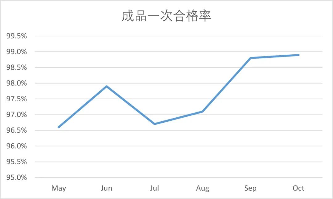 Trí chur i bhfeidhm an tionscnaimh feabhsúcháin mhí seo, tá feabhas suntasach tagtha ar fheasacht cháilíochta na bhfostaithe go léir, agus tá feabhas mór tagtha ar tháscairí cáilíochta. Go sonrach, laghdaíodh go mór lochtanna a bhaineann leis an bhfachtóir "fear" i 5m1e; Tá laghdú suntasach tagtha ar na rátaí suiteála atá ar iarraidh, suiteáil mícheart, agus suiteáil mheasctha; Laghdaíodh go mór guaiseacha cáilíochta féideartha i bpróisis ábhartha; agus tá caighdeán oibríochtúil na bpróiseas optamaithe go leanúnach. Mar thoradh air sin, tá méadú tagtha ar 1-2%ar an toradh chéad phas agus an ráta cáilíochta céad-phas táirge críochnaithe, agus tá laghdú suntasach tagtha ar ghearáin custaiméirí agus ar thuairisceáin táirgí. Léiríonn na feabhsuithe soiléire seo ar shonraí éifeachtacht agus luach an tionscnaimh feabhsúcháin go hiomlán.